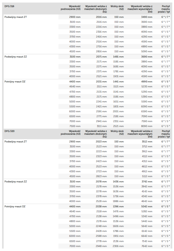 - Wysokość podnoszenia: 2900-7500 mm / Udźwig: 1600-2000 kg